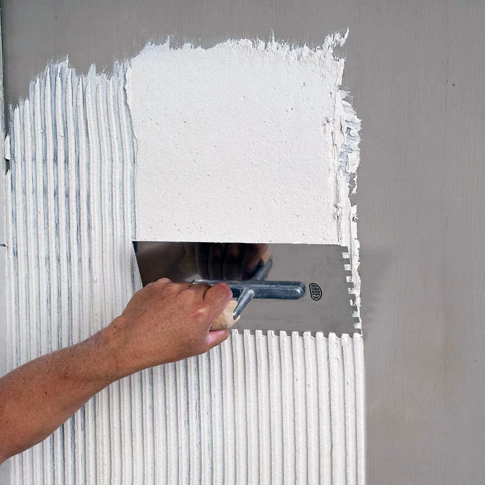 The mixed mortar is applied to the prepared surface with a trowel and then combed through with a suitably sized notched trowel in straight ribs. The tiles should be fixed within the open time of the applied adhesive and pressed into place with a twisting and sliding action to achieve the required contact. For maximum performance at least 80% of the back of the tile should be covered with adhesive. When tiling floors, wet areas or in external locations achieving a solid bed requires buttering the back of the tile immediately prior to placing it onto the ribbed bed, this stops voids from being created beneath the tiles.