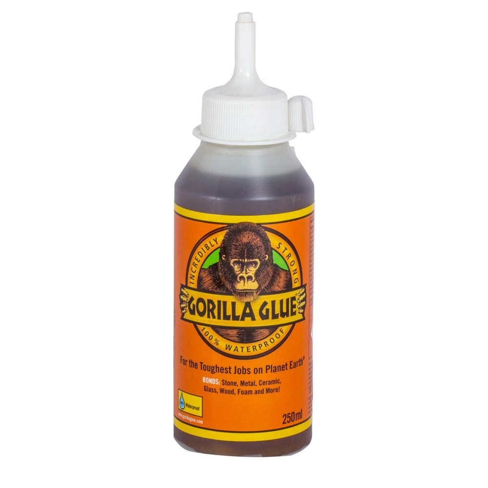Gorilla Polyurethane Glue 250ml reacts when exposed to moisture, with the adhesive reacting and creating a foaming action that fills whilst it sticks. Gorilla Glue has an open working time of 20 minutes. The glue is brown in colour, but dries a tan colour, and is totally waterproof.