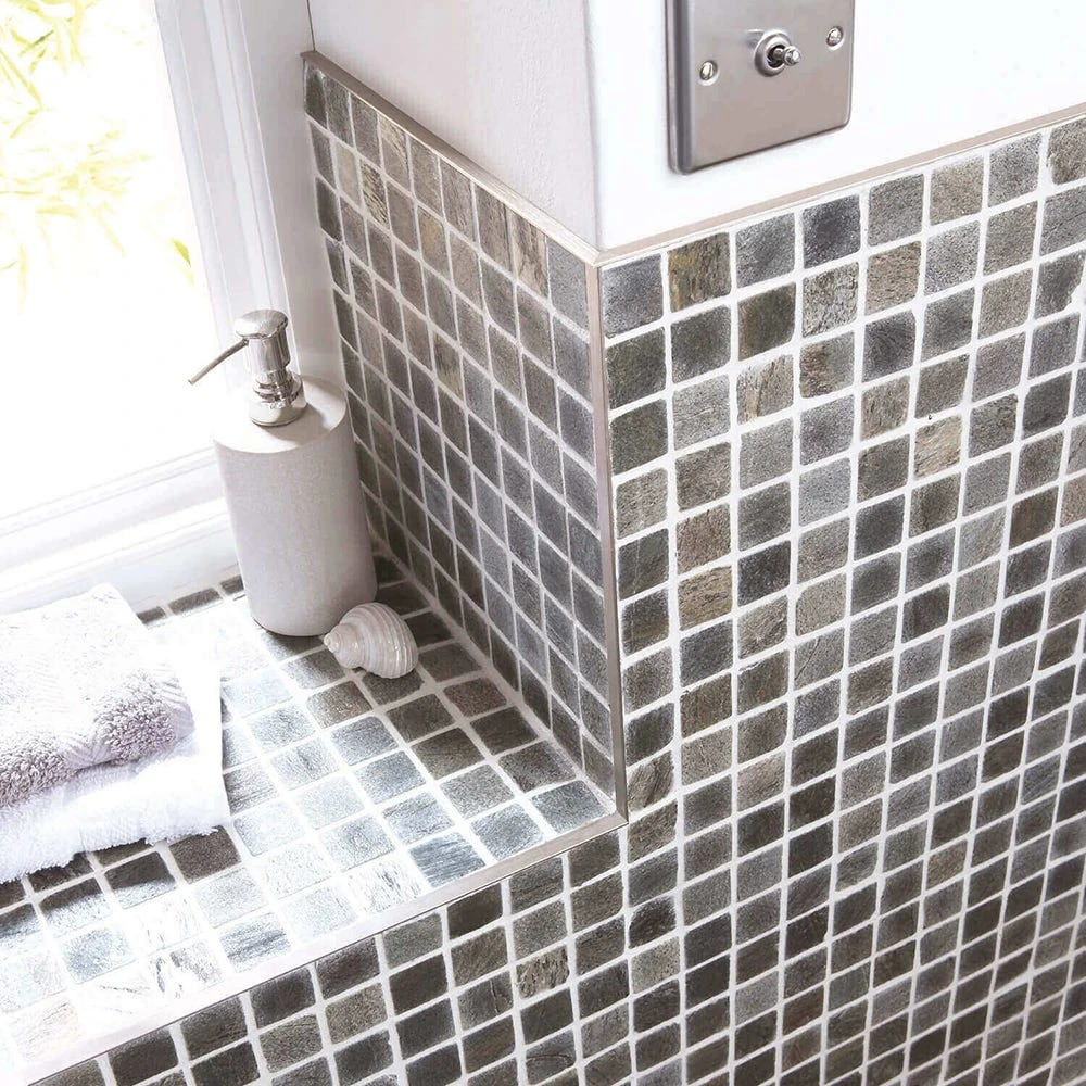 The 10mm Straight Edge S/Steel Effect Metal Tile Trim 2.5m features natural, muted tones, match the latest trends in tiles, complement natural coloured grout and can be matched with metal borders.