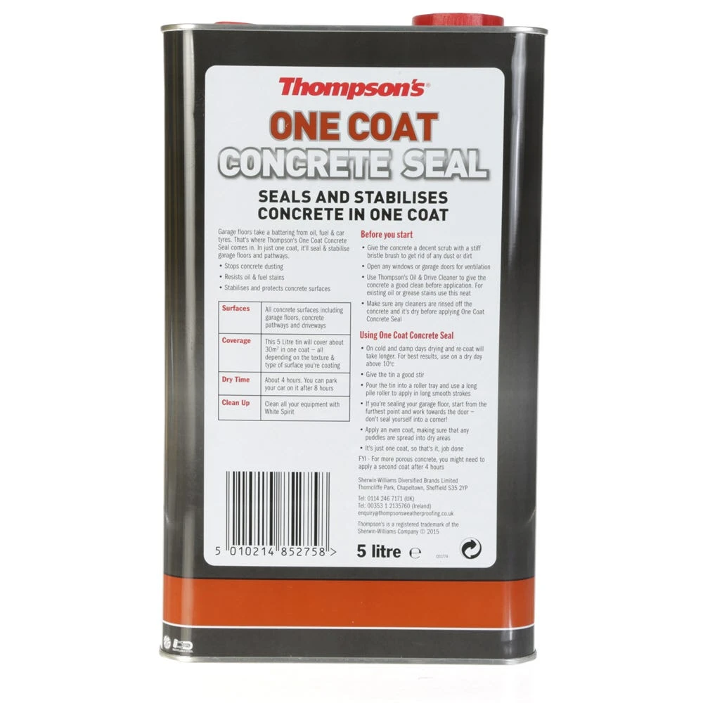 Thompson’s One Coat Concrete Seal 5L is a highly durable stain resistant clear coating. It will seal and stabilise concrete floors and pathways, ready for cars to drive on in just 4 hours.